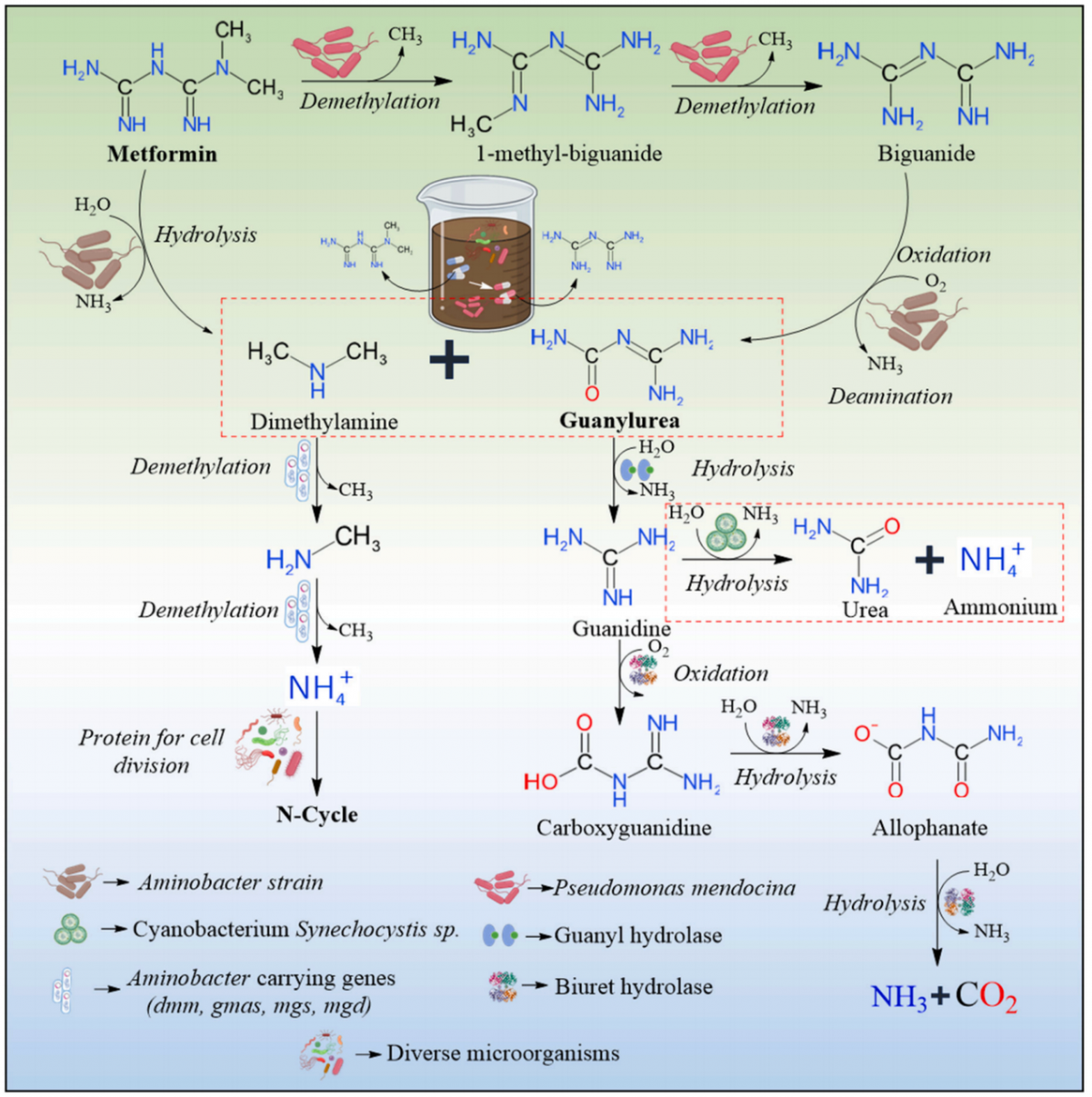 图 3. 有氧条件下二甲双胍和脒基脲的生物降解途径。红色虚线矩形代表两条路径