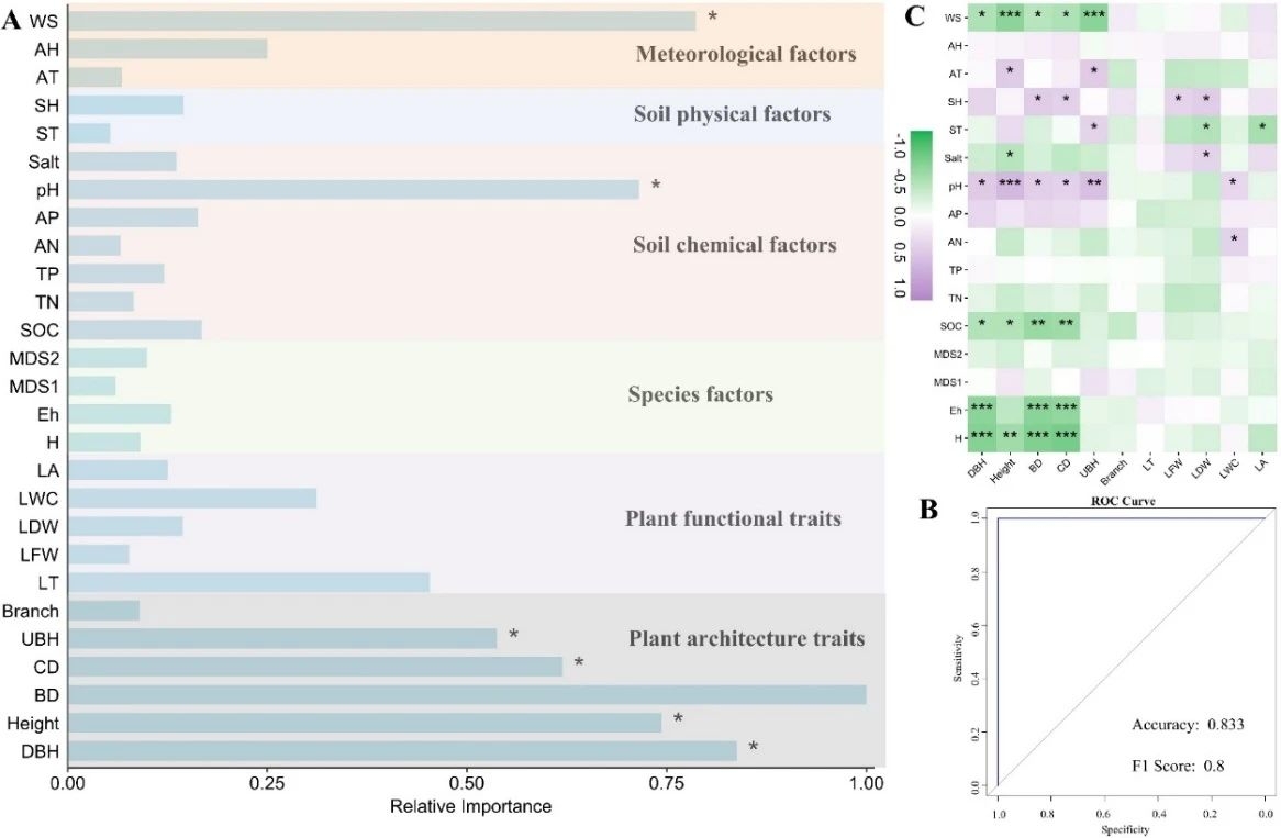图2 各类变量对CDF和NCDF分类模型的相对重要性(A),分类模型的精度评价信息(B)以及植物性状与其它因素的热度图(C)。