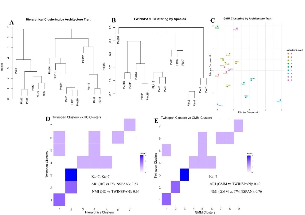 图3 针对CDF的群丛,基于植物构型性状的Hierarchical Clustering(A)、传统的基于物种的TWINSPAN Clustering(B)和基于植物构型性状的GMM Clustering(C);三种聚类结果的交叉表以及一致性评价(D和E)。
