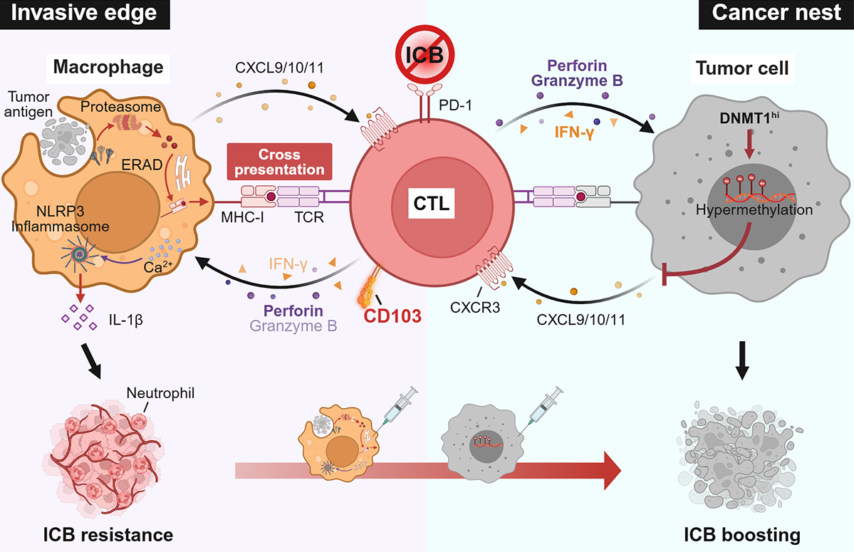 为了探究上述问题,研究团队结合多队列肝癌免疫治疗样本与体内外实验模型,对肝癌中肿瘤反应性CTL的表型、空间分布和功能进行了全面解析研究。结果提示,肝癌中肿瘤反应性CTL主要呈现CD103+ 组织驻留效应表型,这些细胞主要滞留在癌周区域,并且其在癌周和肿瘤内的分布比例可以有效提示患者对ICB治疗的响应性。进一步研究证实,肿瘤反应性CD103+ CTL受癌周巨噬细胞的抗原交叉呈递调控从而滞留在癌周区域,滞留的效应CD103+ CTL通过“穿孔素-钙流”途径反过来激活癌周巨噬细胞的NLRP3炎症小体,促进IL-1β的释放及下游粒细胞募集和血管生成,最终导致免疫治疗超进展。因此,癌周巨噬细胞交叉呈递介导的CD103+ CTL在癌周区域的滞留,不仅削弱了肿瘤内的抗肿瘤免疫,还将CD103+ CTL的效应反应转化为促肿瘤炎症反应。基于此,研究提出联合靶向肿瘤细胞内源性表观遗传沉默和癌周巨噬细胞对CD103+ CTL滞留的治疗策略可有效抑制疾病超进展并显著提高ICB治疗疗效。
