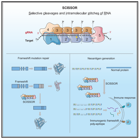 2025年2月19日,我院张锐教授课题组在《Molecular Cell》上发表了题为“Type III CRISPR-mediated flexible RNA excision with engineered guide RNAs”的研究论文,报道了一项重要的技术突破——一种名为SCISSOR(Selective Cleavage and Intramolecular Stitching of RNA)的RNA编辑工具,使我们首次能够在RNA层面进行灵活的裁剪和改变读码框。这一技术突破不仅填补了现有RNA编辑领域的空白,更为各类移码突变导致的遗传疾病和肿瘤免疫治疗提供了全新的解决方案。据悉,该研究成果也被选为Molecular Cell 3月6日出版当期的封面论文重点推荐。