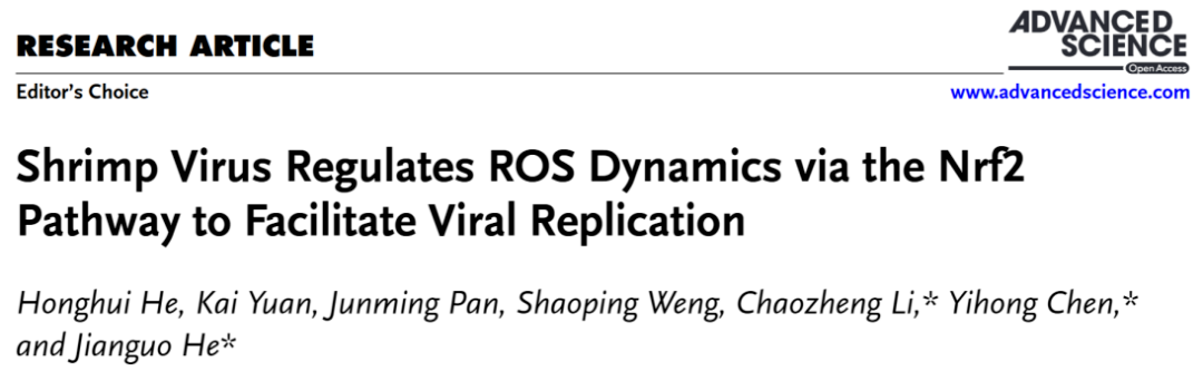 水产动物疾病防控与健康养殖全国重点实验室主任、海角论坛 教授,何建国带领团队揭示了白斑综合征病毒(WSSV)利用Nrf2调控宿主活性氧(ROS)的分子机制。相关研究成果发表于《Advanced Science》,文章题为“Shrimp Virus Regulates ROS Dynamics via the Nrf2 Pathway to Facilitate Viral Replication”。
