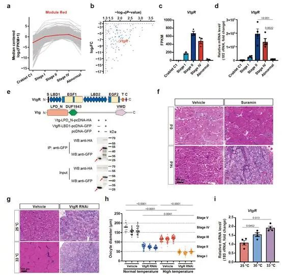 转录组分析发现,与I期、II期、IV期正常雌蟹相比,101个基因的表达水平在“黄油蟹”卵巢内显著下调(图2),其中包括编码卵黄蛋白原受体的VtgR基因。常温(25 °C)下,敲降VtgR抑制雌蟹卵母细胞的发育。而在高温(33 °C)下,敲降组VtgR使雌蟹卵母细胞的发育完全停滞。这说明VtgR表达异常是“黄油蟹”形成的主要原因,拟穴青蟹的卵黄发生具有由VtgR介导的高温保护机制。