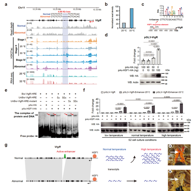 为进一步揭示拟穴青蟹卵黄发生高温保护机制的遗传基础,研究团队利用群体遗传学分析,在“黄油蟹”VtgR基因的第19号内含子中鉴定到一个4.99 kb的缺失。该缺失中包含一个在拟穴青蟹卵黄发生及高温响应中均起到关键作用的增强子(图3)。其次,团队发现热激转录因子1(HSF1)与VtgR的启动子区结合并介导其表达。缺失中的增强子在高温胁迫下促进由HSF1介导的VtgR的表达,维持卵黄蛋白原的正常内吞入卵。由于序列缺失导致“黄油蟹”失去该增强子,使其在高温胁迫下卵黄发生异常。