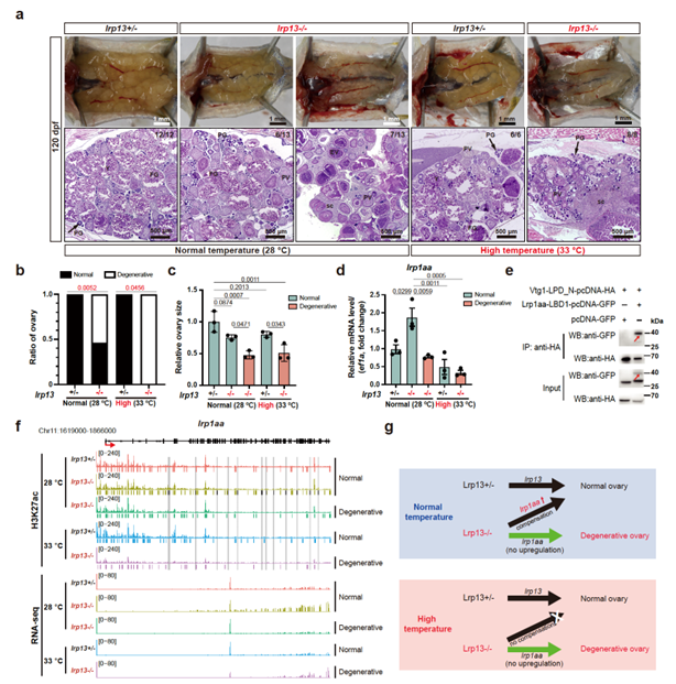团队发现斑马鱼具有相似的卵黄发生高温保护机制。高温胁迫下,斑马鱼卵黄蛋白原受体基因Lrp13的表达水平上调,维持卵黄蛋白原的正常内吞入卵(图4)。斑马鱼具有卵黄蛋白原受体的功能代偿机制。在常温下,另一个卵黄蛋白原受体基因Lrp1aa的表达水平在50%的Lrp13敲除斑马鱼个体中上调,维持卵黄蛋白原的正常入卵。高温抑制Lrp13敲除个体中Lrp1aa表达水平的上调,导致所有敲除个体在高温胁迫下卵黄发生异常。这说明卵黄发生的高温保护机制也存在于卵生变温脊椎动物中,Lrp13在斑马鱼卵黄发生的高温保护机制中起关键作用。