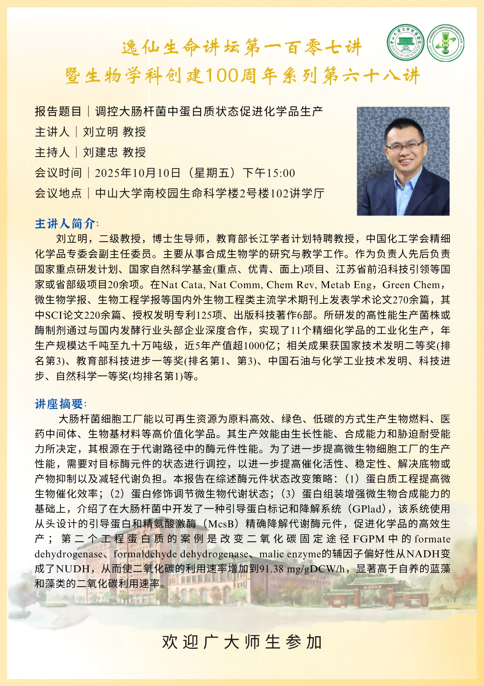 2025年10月10日海角论坛 逸仙生命讲坛第107讲:调控大肠杆菌中蛋白质状态促进化学品生产