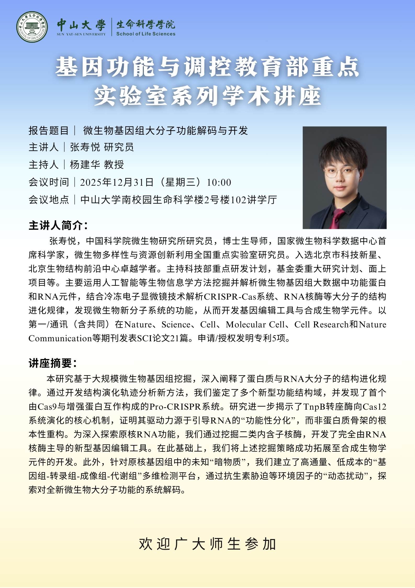 2025年12月31日基因功能与调控教育部重点实验室系列讲座:微生物基因组大分子功能解码与开发