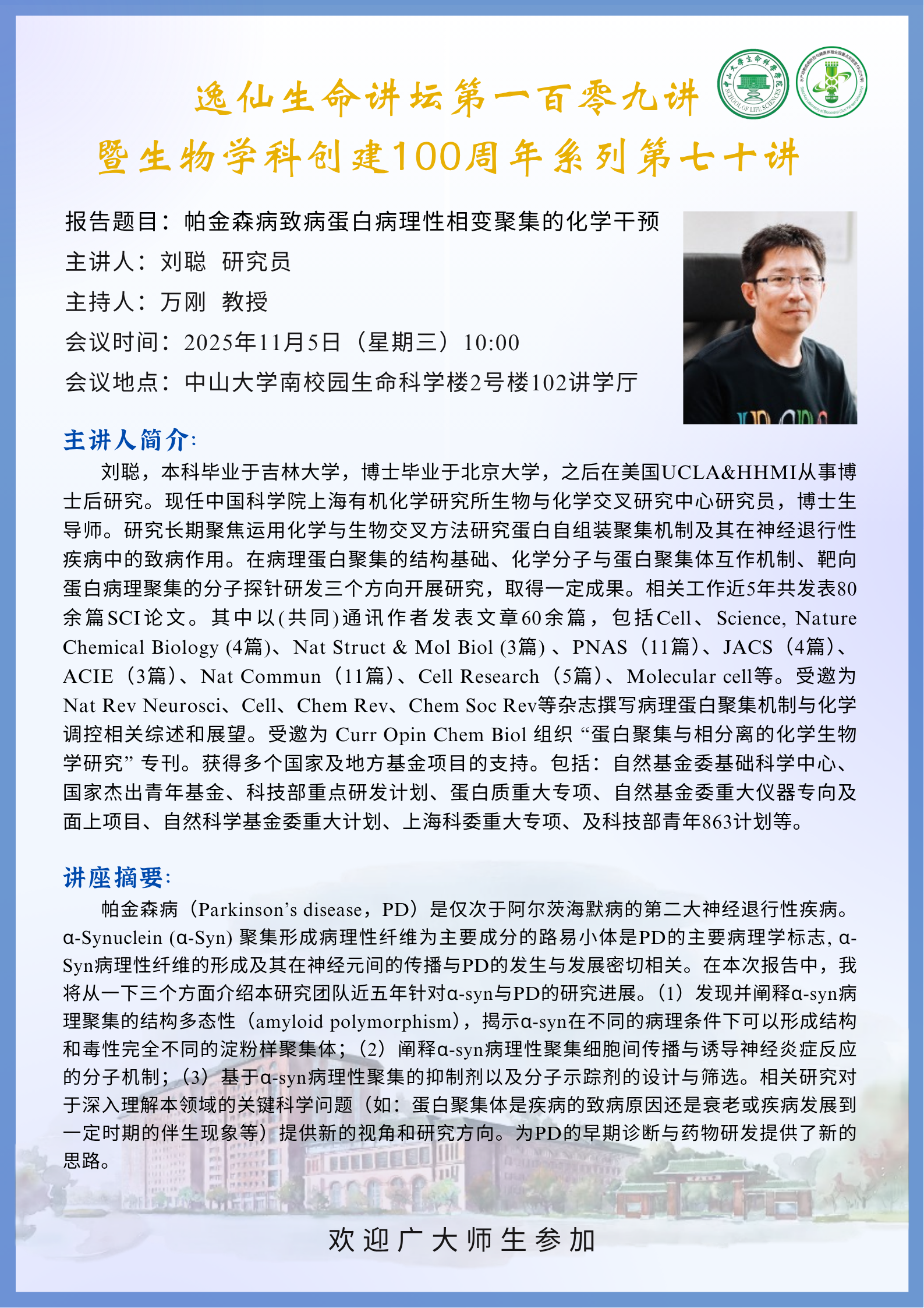 • 2025年11月5日海角论坛 逸仙生命讲坛第109讲:帕金森病致病蛋白病理性相变聚集的化学干预