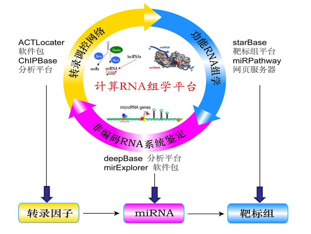 屈良鹄教授团队继创新性研发了DeepBase(从高通量测序数据中系统发掘多种小RNA的计算平台,Nucleic Acids Res 2010)、miRExplorer(高通量发掘miRNA的可视化软件,RNA Biology 2011)、starBase (基于CLIP-Seq 数据鉴定miRNA 功能靶标组的多维高通量分析平台,Nucleic Acids Res 2011)等RNA功能研究的创新性分析平台后,团队又进一步自主研发了ACTlocater和 ChIPBase(微RNA基因和长非编码RNA-转录因子分析平台,Nucleic Acids Res 2012,2013) 两个非编码RNA转录调控网络研究多维高通量分析平台,全面整合和发掘国际ENCODE计划海量数据,解析人类非编码RNA基因与蛋白转录因子的相互作用及细胞特异性,完成人类微RNA和长非编码RNA基因转录因子的高精度预测及鉴定,突破微RNA和长非编码RNA基因表达调控研究关键技术。