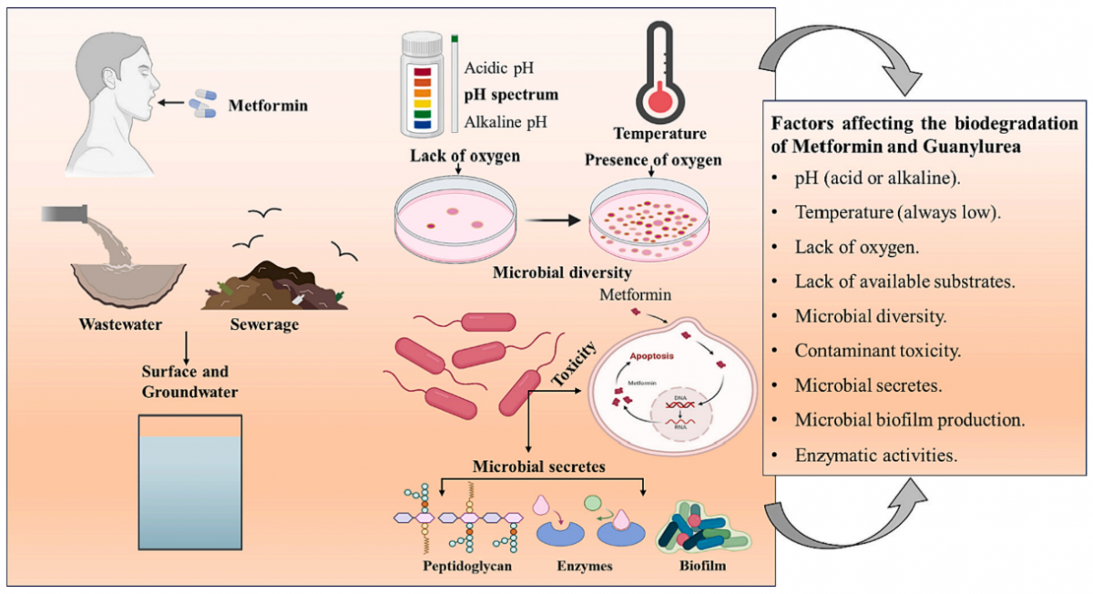 图 2. 影响地表和废水中二甲双胍和脒基脲微生物生物降解的因素