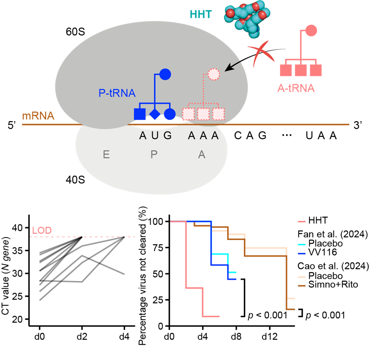 在此基础上,吴仲义/文海军团队通过与国内多家P3/P4实验室合作,证实HHT能在纳摩尔水平广谱抑制多种冠状病毒(包括新冠病毒的beta、delta、omicron株,以及猪流行性腹泻病毒(PEDV)、猪丁型冠状病毒(PDCoV)和猪急性腹泻综合征冠状病毒(SADS-CoV))的复制,并且在多种动物模型中展现出优异的抗冠状病毒活性,效果远优于已上市的多种小分子药物,包括瑞德西韦、莫那匹拉韦、以及Paxlovid等。特别是在新冠疫情后期通过临床研究证实,滴鼻给药HHT能在安全剂量下快速清除受试者体内的病毒,从而为将HHT开发为应对冠状病毒未来疫情的广谱高效药物奠定了坚实的基础。