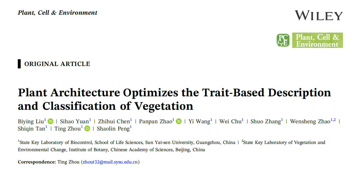 近日,该成果以“Plant Architecture Optimizes the Trait‐Based Description and Classification of Vegetation”为题发表在植物学经典期刊Plant, Cell & Environment上。我院博士研究生刘碧颖为论文第一作者,周婷副教授为通讯作者,博士研究生陈志晖、赵盼盼和王毅,硕士生源思浩、楚薇和赵文胜,本科生谭诗琴为合作作者,彭少麟教授组织了该项工作。该研究得到了国家自然科学基金重大项目和广东省基础与应用基础研究基金等多个项目的资助。