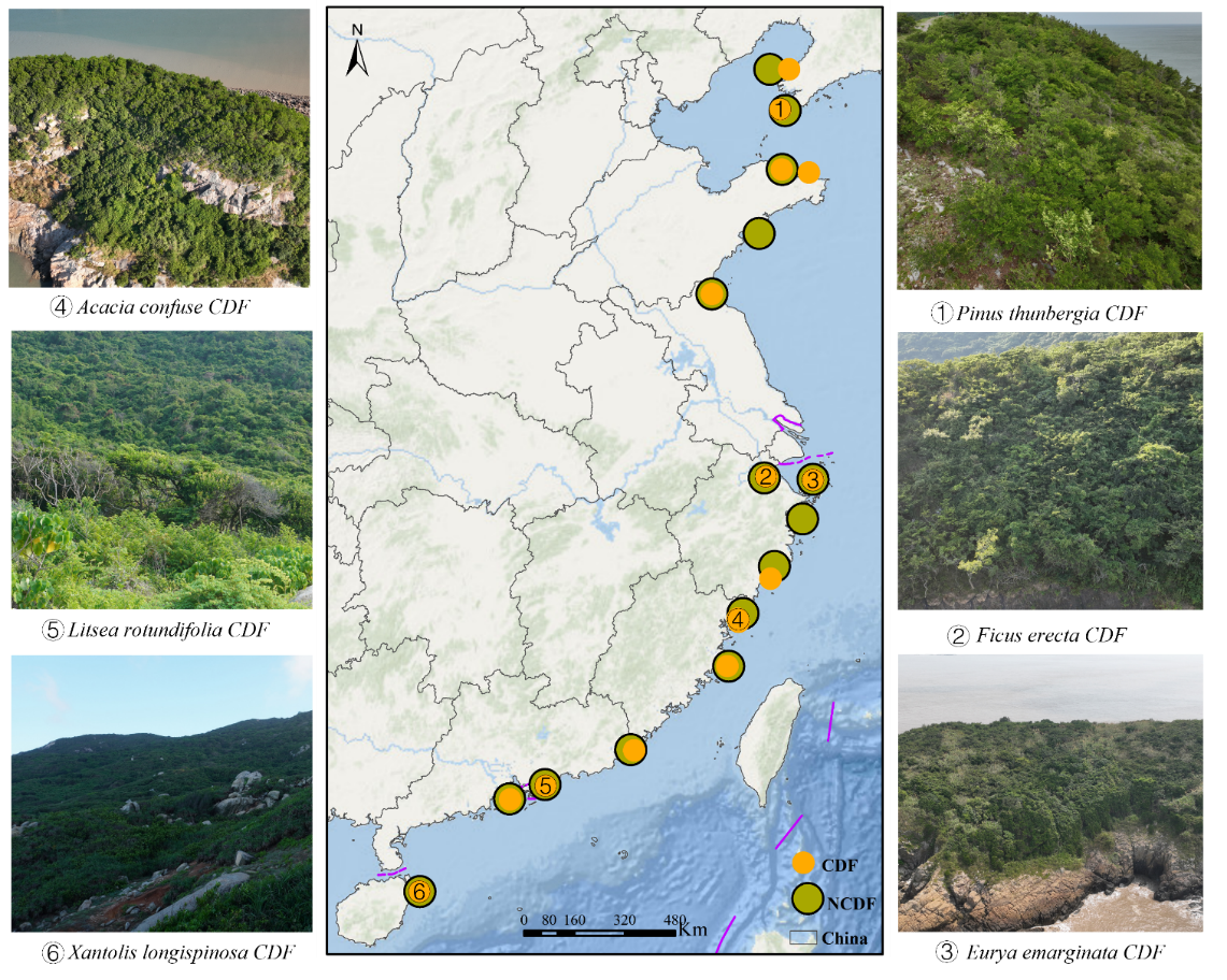 我院彭少麟/周婷团队针对这一科学难题,探讨植物构型在提升植被分类准确性中的作用,在2021年至2023年期间,沿中国东部海岸线建立了多个样地,涵盖了辽宁省至海南省的不同森林类型和物种组成(图1)。通过对沿海矮化森林(CDF)和沿海典型森林(NCDF)的样本进行比较,探讨植物构型性状如何影响植物的生长和生态适应性,并尝试通过植物构型性状实现植被分类。