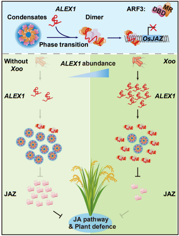 陈月琴教授课题组在鉴定到一个受白叶枯病菌侵染诱导表达的lncRNA ALEX1(A Leaf Expressed and Xoo-induced lncRNA 1)具有增强水稻白叶枯抗性的基础上,进一步揭示了ALEX1与水稻生长素响应因子ARF3直接互作共同调控水稻抗性的分子机制。研究团队发现ARF3可通过其自身的无序中间区域 (middle region,MR) 形成类固态的、无功能的蛋白凝聚体,ALEX1正是通过调节ARF3蛋白凝聚体的动态变化(即抑制无功能的ARF3的类固态相,促进ARF3转变为有功能的二聚体),增强了ARF3转录抑制下游靶基因(如JAZ13)的能力,因此激活了茉莉酸信号通路,增强了水稻的免疫反应。这一研究为抗病基因挖掘和作物遗传改良提供了全新思路和分子靶点。