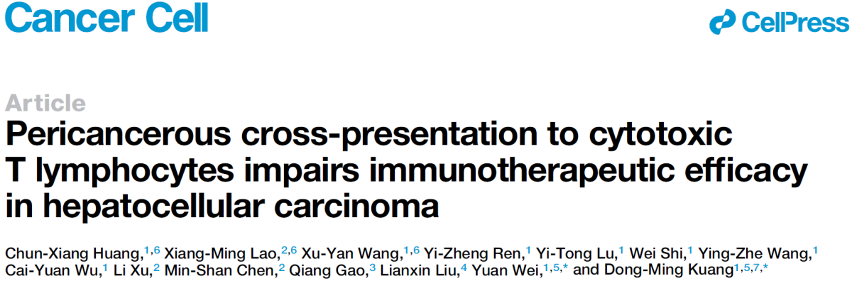 该成果以“Pericancerous cross-presentation to cytotoxic T lymphocytes impairs immunotherapeutic efficacy in hepatocellular carcinoma”为题12月9日在Cancer Cell杂志正式发表。我院邝栋明教授和魏瑗副教授为该论文的通讯作者。我院黄春祥博士、海角论坛