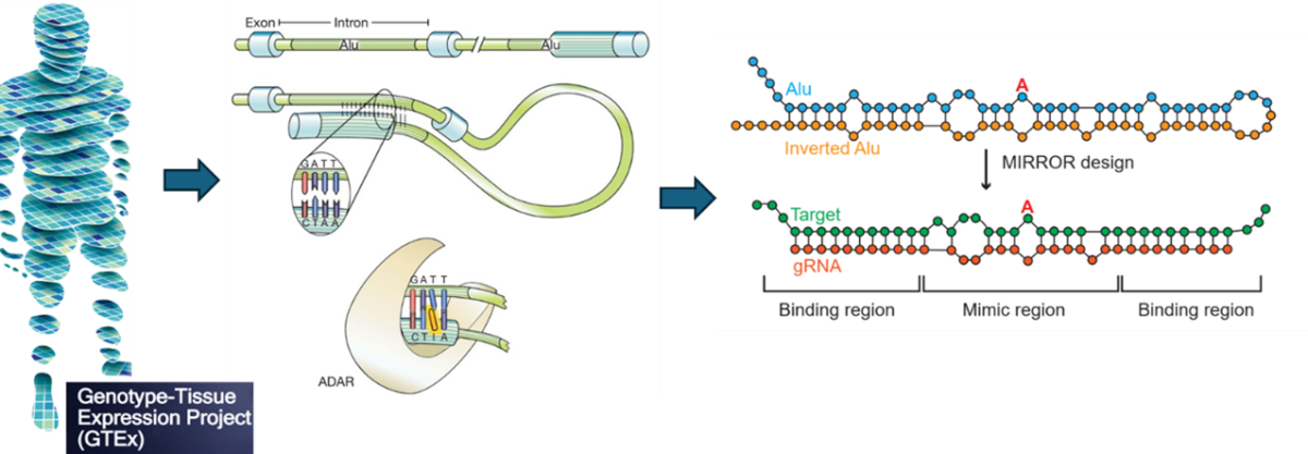 研究团队首先利用GTEx数据集系统性鉴定出超过16万个Alu编辑位点的倒置Alu对,从而构建了迄今为止规模最大的内源性ADAR双链RNA底物结构图谱。在这一过程中,他们进一步筛选出高编辑水平的Alu序列——这些经过数百万年自然选择优化的双链RNA揭示了ADAR识别底物的关键结构特征。基于这一发现,团队开发出一种模拟天然底物构象的gRNA设计算法,并结合高通量细胞内筛选系统,从数千种候选MIRROR gRNA中筛选出最为高效的版本。