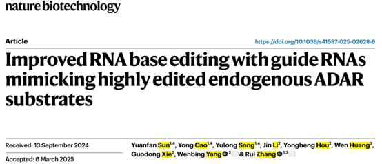 Nat Biotechnology | 我院张锐教授团队开发基于内源ADAR招募的高效体内单碱基RNA编辑技术