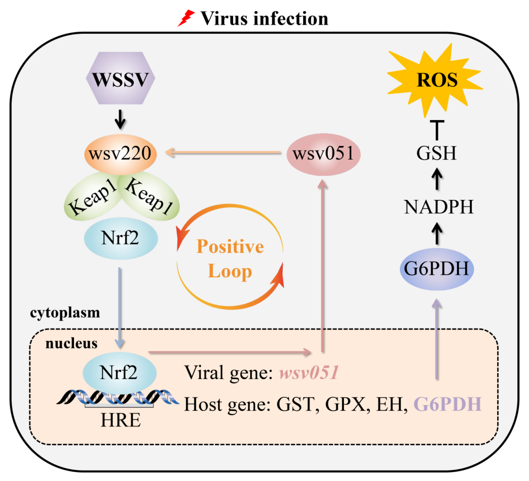 WSSV是一种广泛感染甲壳类动物的双链DNA病毒,其引起的白斑综合征(WSS)是危害对虾养殖业最严重的病毒性疫病。WSSV感染初期,宿主产生大量ROS,随后宿主ROS又显著减少。基于这一现象,何建国教授团队发现WSSV编码病毒蛋白wsv220竞争性结合对虾Kelch样ECH相关蛋白1(Keap1),Keap1是核因子E2相关因子2(Nrf2)的负调控因子,可增强胞质Nrf2的稳定性并促进其入核。Nrf2的激活导致下游葡萄糖-6-磷酸脱氢酶(G6PDH)上调,促进了烟酰胺腺嘌呤二核苷酸磷酸(NADPH)和谷胱甘肽(GSH)的产生,有效消除宿主产生的过量ROS。同时,WSSV利用Nrf2上调病毒极早期基因wsv051以建立正反馈回路,进一步增强wsv220等病毒蛋白的表达。