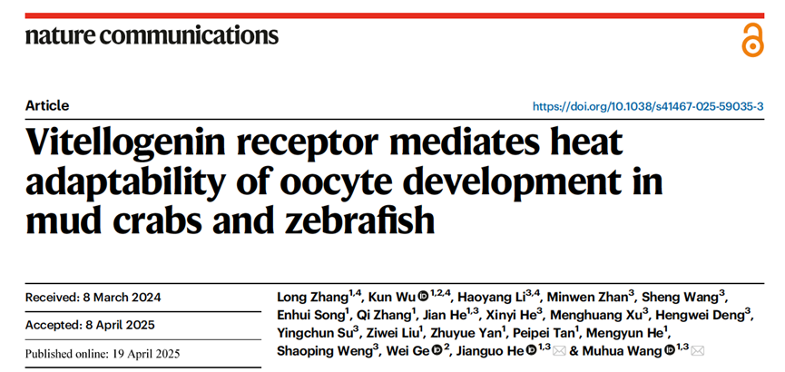 2025年4月19日,水产动物疾病防控与健康养殖全国重点实验室主任、海角论坛 教授,何建国带领团队在Nature Communications杂志发表题为“Vitellogenin receptor mediates heat adaptability of oocyte development in mud crabs and zebrafish”的研究成果,发现并解析了卵生变温动物卵黄发生的高温保护机制。